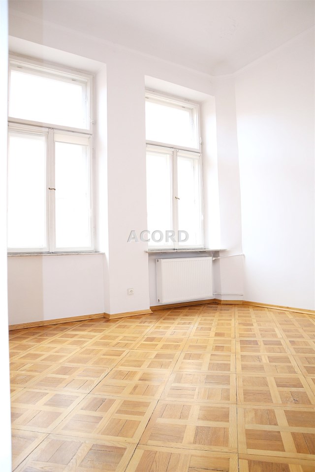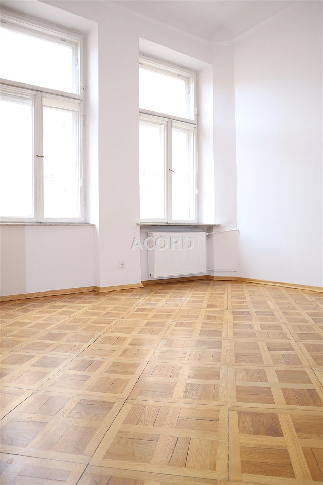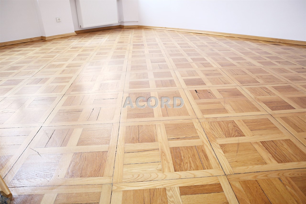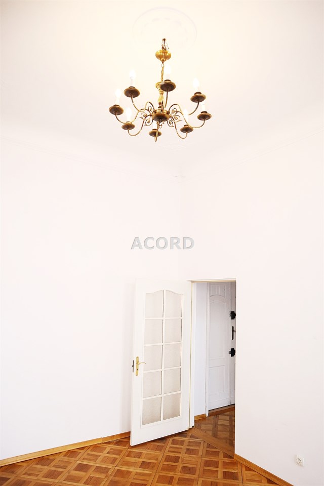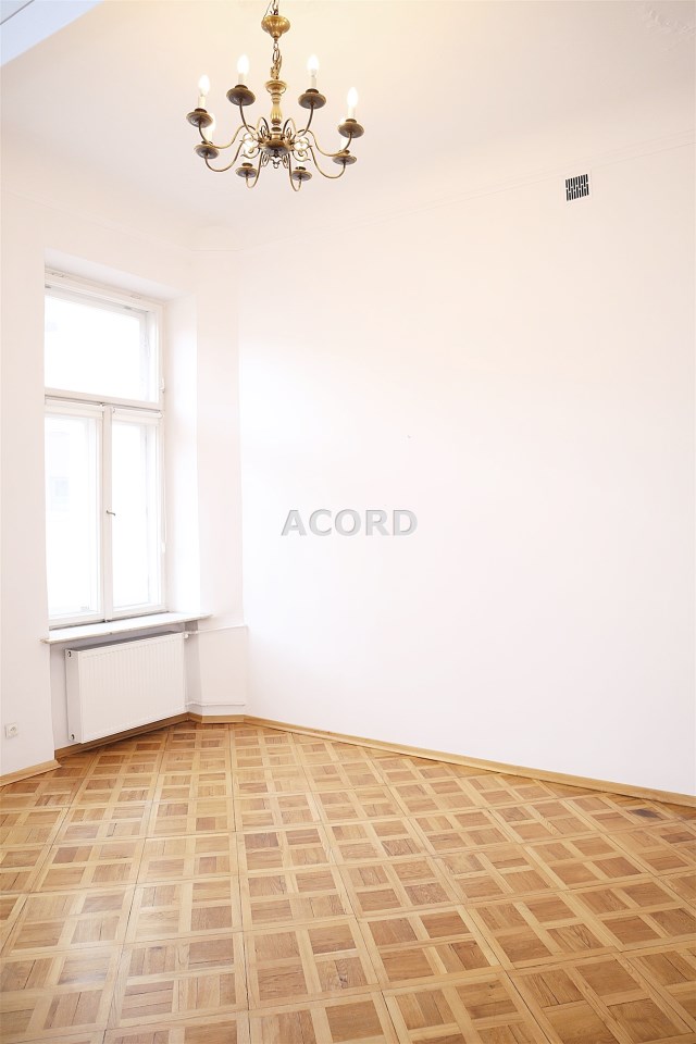 Wnętrze z zachowaniem stylu: sztukaterie na suficie, dębowy parkiet, drewniane okna.