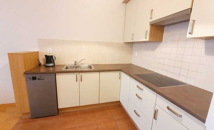 Kuchnia z dużą ilością szafek oraz sprzętem AGD (lodówko-zamrażarka, zmywarka, płyta ceramiczna, wyciąg, czajnik). Nie ma piekarnika.