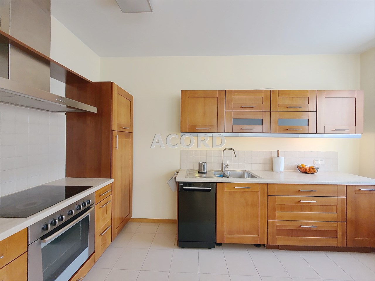 Kuchnia z dużą ilością szafek oraz sprzętem: lodówko-zamrażarka, płyta indukcyjna, piekarnik, wyciąg, zmywarka.
