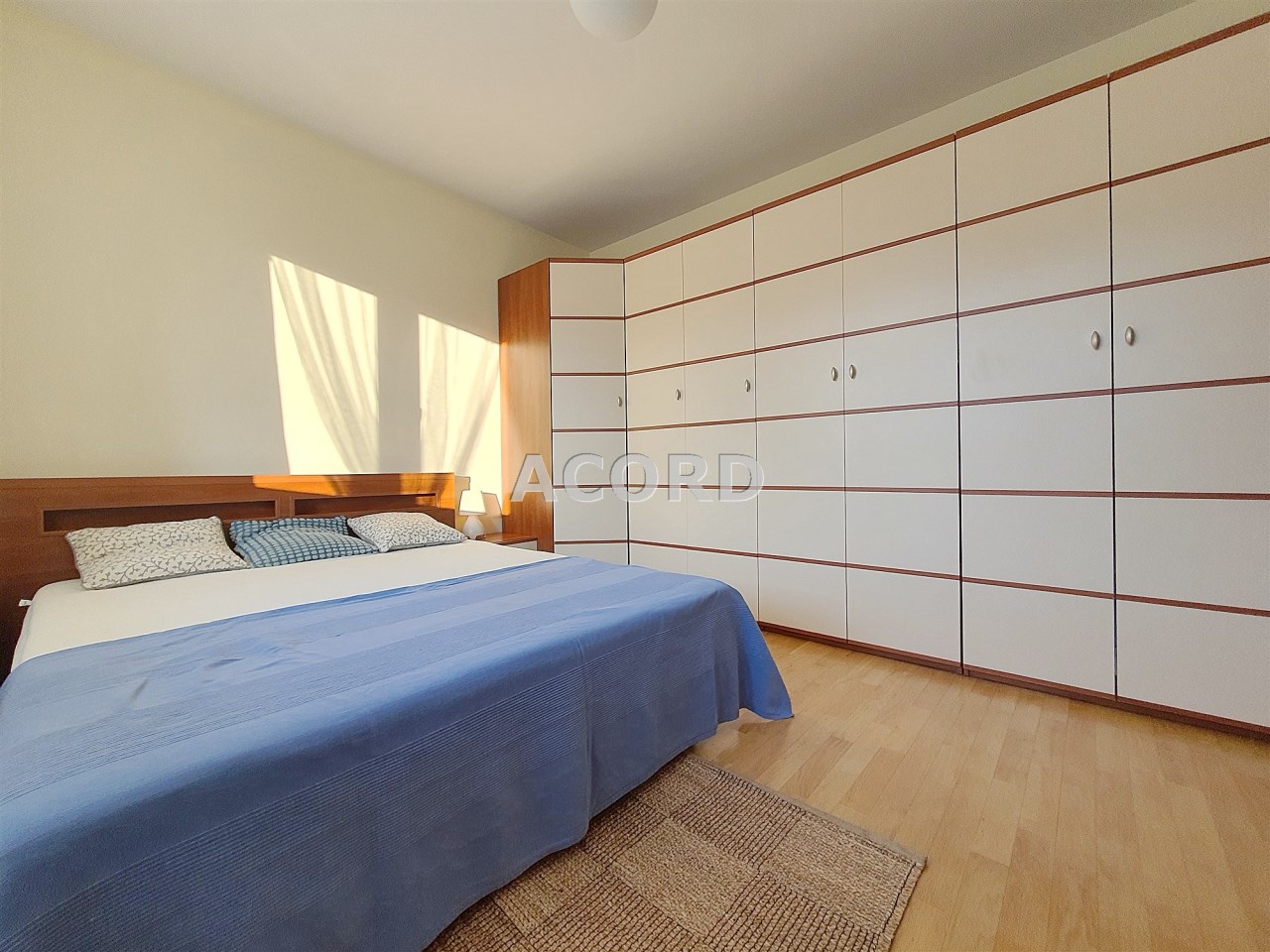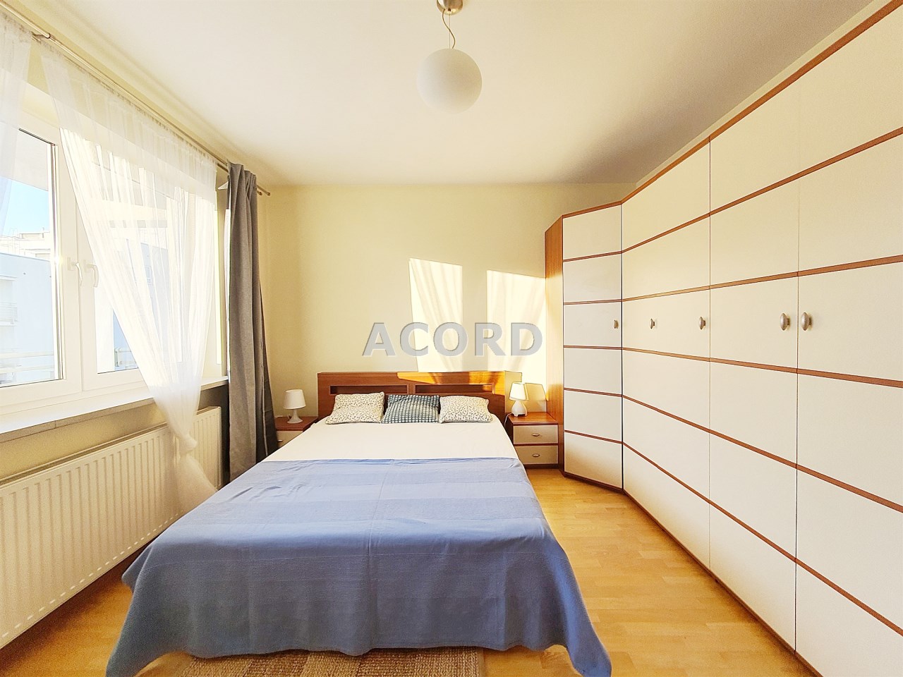 Sypialnia wyposażona w duże sypialniane łóżko z wygodnym materacem, szafeczkami nocnymi i olbrzymią szafą garderobianą.