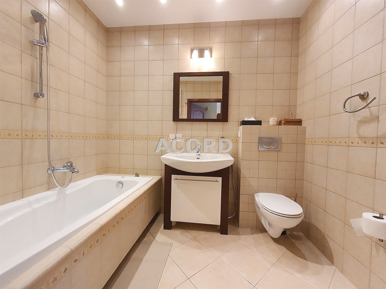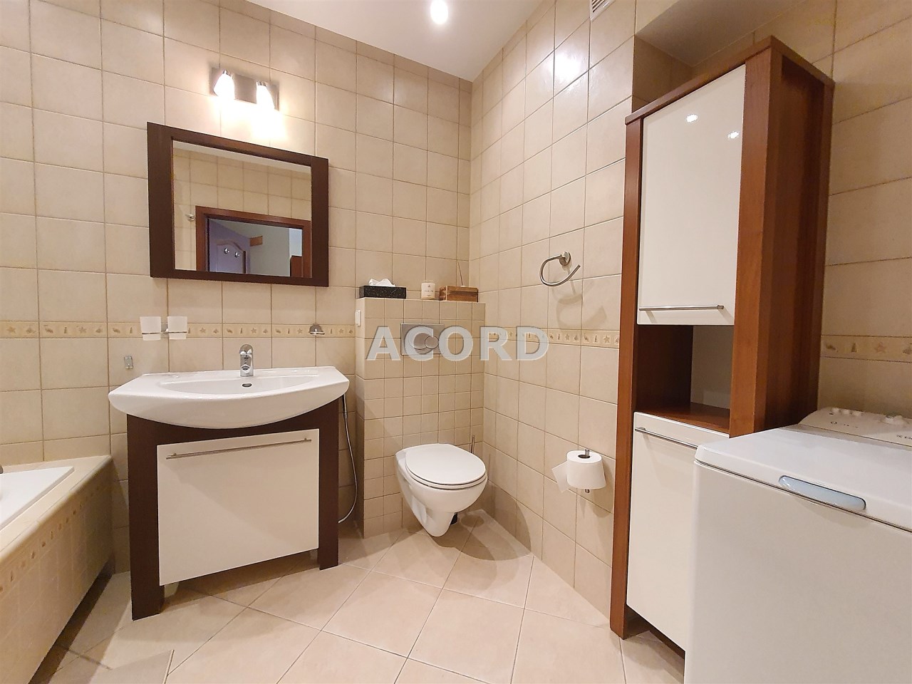 W łazience pralka, duża wanna, umywalka, WC z bidetką, szafeczki łazienkowe.