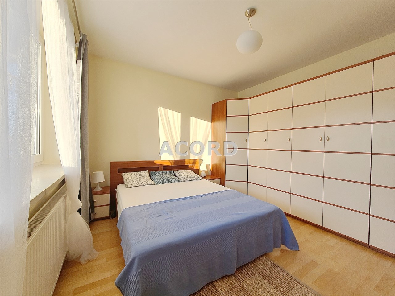 Sypialnia wyposażona w duże sypialniane łóżko z wygodnym materacem, szafeczkami nocnymi i olbrzymią szafą garderobianą.