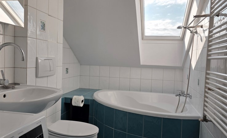 W łazience wanna narożna, a nad nią w suficie urocze okno dachowe.